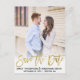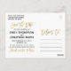 Envie nossos cartões-postais de casamento com foto do casal com uma escrita em falso dourado para informar aos convidados que eles devem reservar a data do seu casamento. Você pode escolher entre um dos esquemas de cores pré-projetados disponíveis ou selecionar um dos desenhos de cores chapadas (com texto preto, por exemplo) e, em seguida, alterar as cores para a cor personalizada desejada. Basta clicar no botão "Editar Design", clicar no texto que você gostaria de alterar e, em seguida, adicionar suas cores personalizadas. Certifique-se de verificar nossa grande seleção de cartões, cartões-postais e ímãs de "save the date" com foto, navegando em nossa coleção de "Picture Save the Date"!