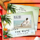 Cartão postal de salvar a data com a sua foto favorita emoldurada por uma cena de praia verde turquesa tropical com palmeiras, lanternas festivas e flores exóticas coloridas. Perfeito para um casamento de praia planejado ou destino. (Sua foto deve girar automaticamente para se ajustar à moldura).