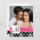 Elegante padrão de damasco preto e branco vintage com cartão postal de Save the Date de foto de noivado com cor de destaque rosa. Envie os anúncios de seu noivado para os convidados de seu casamento com este lindo cartão postal, personalizando-o com sua foto de noivado, monograma inicial, nomes da noiva e do noivo e data do casamento. Desenhado por Elke Clarke © Gráficos e foto de amostra licenciada para uso.