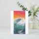 Uma sereia de cabelos azuis cavalga uma onda crestada azul-esverdeada sob um céu rico em amarelo e rosa. Sua longa cauda escamosa varre a água, mudando de verde para azul conforme a luz e as sombras variam.