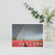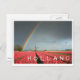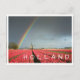 Cartão-postal de um arco-íris colorido num céu escuro sobre um moinho de vento e um cheio de campo de tulipas vermelhas brilhantes durante uma tempestade primavera num cenário perto de Amesterdã, nos Países Baixos, com uma borda branca e o texto: "Holanda".