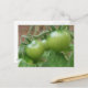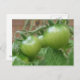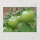 Este belo cartão-postal mostra uma fotografia de um par de tomates verdes de cereja crus que crescem numa fábrica de tomate num jardim suburbano. A fotografia foi tirada usando macro fotografia para um resultado detalhado.