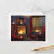 Um canto de leitura aconchegante num dia chuvoso de outono. Em torno da lareira com um fogo crepitante estão poltronas vermelhas confortáveis, com pilhas de livros e bolinhos e um bule de chá para completar o conforto. Do lado de fora, um salgueiro amarelo e um bordo vermelho e um hedge de faia estão obscurecidos pela chuva que sopra, que salpica a janela onde um gato-gengibre senta-se olhando para fora.