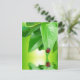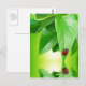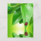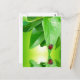 Cartão postal com ladybug em folhas verdes à luz do sol com reflexo de água