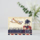 Um cartão postal de salvar a data inspirado em antiguidades para um casamento com tema de viagem. Mostrado em tons de azul-marinho, vermelho-escuro, branco e marrom-claro. Personalize com seus nomes, data do casamento e destino do casamento!