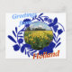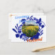 Delft Blue Pattern e Tulip Bulb Fields Saudações do Holland Postcard. Padrão neerlandês Delft Blue (Delfts Blauw) de estilo antigo com uma imagem holandesa totalmente personalizável (mude e carregue a sua própria imagem!) floricultura amarela com moinho de vento e texto totalmente personalizável "Saudações da Holanda" — cartão postal do souvenir. Este belo presente de cartão postal da Holland é totalmente personalizável, adicione sua imagem e texto!
