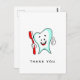 Obrigado cartão postal com uma ilustração de um estilo de desenho animado, grande dente branco sorrindo alegremente segurando uma escova de dentes vermelha e dando os polegares para cima.