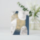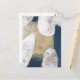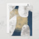Uma grande forma abstrata em azul-marinho cobre a tela de ponta a ponta com recortes revelando um fundo branco texturizado. Uma área bege desgastada e texturizada assenta sobre a forma azul enquanto linhas brancas se contorcem como corda num acabamento dinâmico da peça.