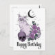 Cartão de aniversário com votos góticos felizes. Gato estilo goth com lua crescente, caveira e rosas em uma paleta de cores preta e roxa que sua garota gótica vai adorar. Personalize o campo de texto interno para um cartão de aniversário verdadeiramente mágico.