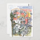 Um cartão postal com um desenho das zinnias do jardim de verão e uma noite tempestuosa, à medida que o sol começa a se pôr na mão do deserto desenhada com tinta preta e pintada com aquarela.