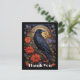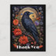 Obrigado cartão postal com um corvo preto estrelado num galho rodeado por flores vermelhas. Legal vibração gótica.