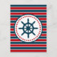 Design náutico com decoração das rodas de vela em forma redonda com estrelas sobre fundo listrado vermelho, azul e branco