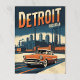 Um pôster de viagem com tema retrô para Detroit, Michigan, apresenta um carro clássico laranja dirigindo em uma estrada em direção a uma paisagem urbana com edifícios industriais e fábricas sob um céu azul escuro com um gradiente laranja. "DETROIT" é exibido de forma proeminente no topo.