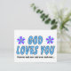 Deus te ama para sempre e sempre e sempre... Esta é uma bela imagem cristã de uma grande frase escrita com letras azuis e contorno preto. Há duas flores azuis e roxas no design. Design por Diligent Heart