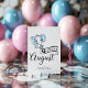 Elefante de bebê adorável com orelhas bolinhas azuis, tipografia "due in August" e modelo para mensagem especial anunciando gravidez.