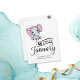 Elefante de menina adorável com orelhas de bolinhas rosa e arco minúsculo ao longo do ouvido, tipografia "Devido em janeiro", e modelo para mensagem especial anunciando gravidez.