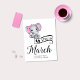 Elefante de menina adorável com orelhas de bolinhas rosa e arco rosa minúsculo acima do ouvido, tipografia "Devido em março" e modelo para mensagem especial anunciando gravidez.