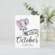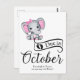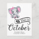 Elefante de menina adorável com orelhas de bolinhas rosa e arco rosa minúsculo acima do ouvido, tipografia "Devido em outubro" e modelo para mensagem especial anunciando gravidez.