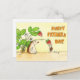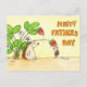 Este cartão mostra um pai de ouriço com seu filho. No lado esquerdo do cartão, uma planta de morango está crescendo. Está florescendo e com fruta. Morangos vermelhos estão pendurados nas extremidades dos caules longos. Ambos os ouriços são muito menores que a planta. O ouriço está tentando pegar um morango, mas ele é pequeno demais e não consegue alcançá-lo. Seu pai, que é mais alto, é gentil o suficiente, para agarrar o tronco e dobrá-lo para baixo para que seu filho possa alcançá-lo. Ao lado da planta de morango está escrito "Dia de os pais feliz" numa cor castanho quente, que corresponde à paleta de cor quente do fundo amarelo e do solo laranja.