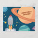 Cartão postal com um design de espaço exterior divertido com planetas, foguetes e estrelas. Tem texto dizendo Saudações Amigos, mas pode ser personalizado.