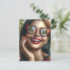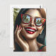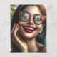 Mantenha contato com este cartão-postal fofo. Uma bela mulher feliz sorrindo com batom vermelho e óculos de sol com reflexo de palmeiras neles.