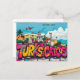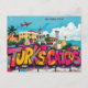 Cartão postal das Ilhas Turks e Caicos, Reino Unido! Este postal no estilo grafite apresenta um grande script Turks & Caicos em cor-de-rosa amarelo, em frente à ilha abstrato com seus prédios e o céu. Todas as frases de texto podem ser personalizadas para você!