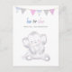Adorável design moderno com um elefante bebê com uma faixa de cinza/cor-de-rosa e azul no topo onde "ele ou ela o que será o nosso amendoim?" é entitulado. Do lado oposto estão nossos modelos de convite, verde e varinha com bolhas fluindo.
