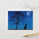 Um desenho de uma silhueta de lobo preto uivando para a lua com uma árvore ao fundo.