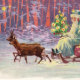 Feliz Natal das Florestas de Viena! O pequeno trenó do Papai Noel é puxado por dois delicados renques através de uma floresta nevada. A cena está iluminada pelas luzes da pequena árvore de Natal viajante. Cores coral, lavanda e aqua em um padrão abstrato criam um maravilhoso cenário teatral. Esta ilustração europeia antiga viajou graciosamente através do tempo para decorar nossa correspondência e presentes de Natal do século XXI. As cores da moda e a imagem única são perfeitas para os seus eventos de Natal. O cartão-postal único com cores da moda tem um design coordenado no verso.
