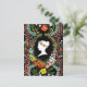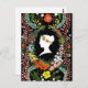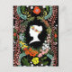 Este cartão-postal registra um poema de amor escrito por um menino a uma menina na "língua das flores", o meio de comunicação da era vitoriana no qual várias flores e arranjos florais foram usados para enviar mensagens codificadas, permitindo que os indivíduos expressem sentimentos que de outra forma não poderiam ser falados. A partir do lado esquerdo da coroa até o lado direito, cada flor revela mais uma parte do quebra-cabeça ausente. Incluídos no poema estão os globos de amaranto, suspensórios de olhos negros, margaridas, papoilas, dandeliões, tulipas matinais, rosas, magnólias, folhas de louro, louretas, nãos-me-esquecidos, melada. Tente decifrar o poema com seu guia aqui: http://en.wikipedia.org/wiki/Language_of_flowers A silhueta da Rainha Vitória toma dramaticamente o palco central sobre o fundo negro como símbolo da era e como amante da beleza e vestígio de flores no cabelo.