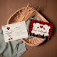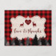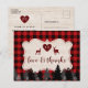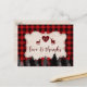 Design de cartão único com forma de madeira, fundo de xadrez de búfalo vermelho, silhueta florestal, coração de xadrez de búfalo vermelho para monograma, veados fofos, um lindo roteiro de "amor e obrigados" com efeito de xadrez vermelha. Na parte de trás, um fundo de madeira lavado. Use a ferramenta Personalizar para adicionar suas informações. Para obter itens correspondentes, visite minha Coleção de Partido Lumberjack.