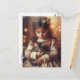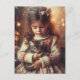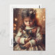 Bela nostálgica cartão de Natal antiquado. Uma garotinha segurando um gatinho numa noite de inverno nevada.