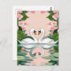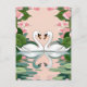 A imagem mostra dois cisnes nadando em uma lagoa com flores cor-de-rosa ao fundo. Os cisnes estão virados um para o outro e os seus pescoços estão entrelaçados em forma de coração. O lago está rodeado por almofadas de lírios e lírios de água. O céu é cor-de-rosa suave com nuvens no fundo. O humor geral da imagem é romântico e pacífico.