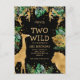 Este convite de festa de segundo aniversário com tema de safári "dois selvagens" apresenta animais em folha falsa dourada (girafa, leão e macacos), folhagem da selva dourada e verde, e uma pitada de confete dourado em um fundo preto. Adicione o nome do menino ou menina aniversariante e os detalhes da festa em texto preto na frente e seu endereço de retorno no verso.