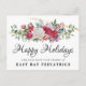 A vegetação natalícia festiva inclui a sagrada e as bagas, o eucalipto e o pinheiro. Rosas vermelhos e brancos adicionam um belo toque floral, enquanto Enfeites de natal listrados vermelhos e brancos e canas doces adicionam uma vibração de férias. Uma espiral de ouro acrescenta uma sensação em alta. As saudações de férias estão incluídas na frente e no verso do cartão postal. Todo o texto é editável.