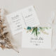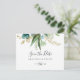 Esta horizontal tropical floral dourada, exceto o cartão postal é perfeito para um casamento de destino. A design apresenta predominantemente folhagem verde-aquosa pintada manualmente, associada a flores douradas.