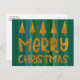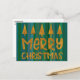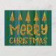 Cartão Postal Dourado Feliz Natal e Árvores com faixas verdes