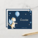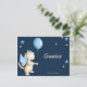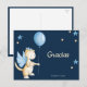 Precioso cartão postal de agradecimento pelo chá de bebê para reconhecer os presentes dos seus convidados. O cartão postal tem um lindo fundo azul-marinho onde a ilustração de um dragão bebê com asas azuis está segurando um balão de hélio azul claro. Para complementar a ilustração, há algumas estrelas azuis e círculos amarelos espalhados aqui e ali.