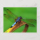 Uma libélula azul senta-se silenciosamente sobre uma folha de grama contra um fundo verde.