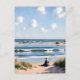 Deze rustige scène toont een vrouw die alleen op het strand zit en naar de zee kijkt. De golven rollen zachtjes tegen de kust onder een blauwe lucht met donzige wolken. De duinen omkaderen de horizon, een intieme en serene sfeer van dit mooie strandtafereel. Ze droomt over de toekomst en overdenkt haar leven, misschien genietend van een moment van rust en ontsnapping uit de dagelijkse drukte. Haar gedachten dwalen af naar verre oorden en nieuwe avonturen, terwijl ze de kalmerende invloed van de zee op zich laat inwerken.