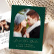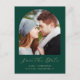 Este simples e minimalista cartão postal Save the Date apresenta uma fotografia em forma de arco acima das palavras "Save the Date" em elegante guião de escrita manual dourada, seguida pelos nomes dos casais, data do casamento e cidade em sans serif num fundo verde esmeralda. Adicione uma segunda foto horizontal retangular no verso, juntamente com seu endereço de retorno e texto adicional com mais informações ou detalhes.