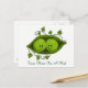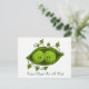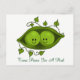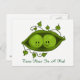 Uma vagem de ervilha verde rodeada de folhas verdes. Dentro a cápsula amontoada são duas ervilhas adoráveis com os rostos mais bonitos. Abaixo está uma modelo de texto lendo duas ervilhas em uma cápsula, que você pode usar como está ou mudar para seu próprio texto.