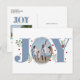 Joy azul empoeirado com as bagas Foto de Natal Cartão-postal de Natal. Mostra a palavra "JOY" com bagas vermelhas e verde enquanto em vez da letra "O" está a sua foto.