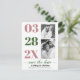 Rosa Dusty e verde-musgo duas fotos Salve o cartão postal Date. Mostra a data em rosa cor-de-rosa empoeirado e tipografia verde-musgo numa coluna e duas fotos do casal. A frase "Salvar a Data" está na tipografia do estilo do script.