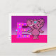 Elefante de desenho bonito com letra alfabética E em tons de rosa e roxo, cartão postal.