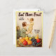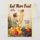 Imagem poster vintage de Joseph Bruno Moran, encorajando pessoas a COMER MAIS FRUTAS, incluindo as palavras "e manter o ajustado", "as frutas da saúde perfeita", retratando uma tigela de frutas, mãe e criança. A única coisa que falta é garantir que as frutas sejam certificadas como orgânicas (não OGM). Incentivar outros a adotarem uma dieta mais saudável com essa imagem