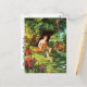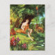 Linda pintura vintage colorida de Adão no Jardim do Éden com flores lindas, árvores, lago, leão, pavão, cervo e elefante, e pássaros, com Adão sentado ao lado da margem da água acariciando o cervo. Linda pintura com Adão da história de Adão e Eva do livro de Gênesis no Antigo Testamento, enquanto ele senta ao lado da água um cervo senta perto dele, um leão observa, um papagaio senta em uma árvore, um pavão senta em um galho de árvore, e um elefante se aproxima dele à distância, com flores rosa e roxas, grande palmeira e lagos.
