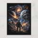 A lone astronaut stands on an alien world beneath swirling galaxies and distant starships, ready to face an epic cosmic conflict.