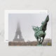 Topo da Torre Eiffel perdido na névoa com estátua Bir-hakeim La France Renaissante em primeiro plano - Paris, França