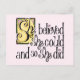 Ela acreditava que poderia, e então fez o cartão postal é desenhado à mão e pintado com aquarela. Enquanto o ditado é uma declaração maravilhosamente poderosa para as mulheres em todo lugar, ela foi criada em um estilo caprichoso. A letra desenhada pela mão tem serifas, espirais, alguns pontos, e corações; enquanto sendo uma letra feminina, é alta, forte e ousadamente negra. A primeira palavra, "Ela" é grande, enquadrada, e com um fundo amarelo contrastante, de modo que se destacará maravilhosamente como se dissesse ao mundo, Ela (sim) alcançou seus objetivos! A colocação das palavras cria uma imagem agradável e artisticamente equilibrada, combinada com as cores rosa e amarela - é totalmente uma criação para as mulheres por uma mulher. Perfeito para a graduação ou parabéns de qualquer tipo para ela.